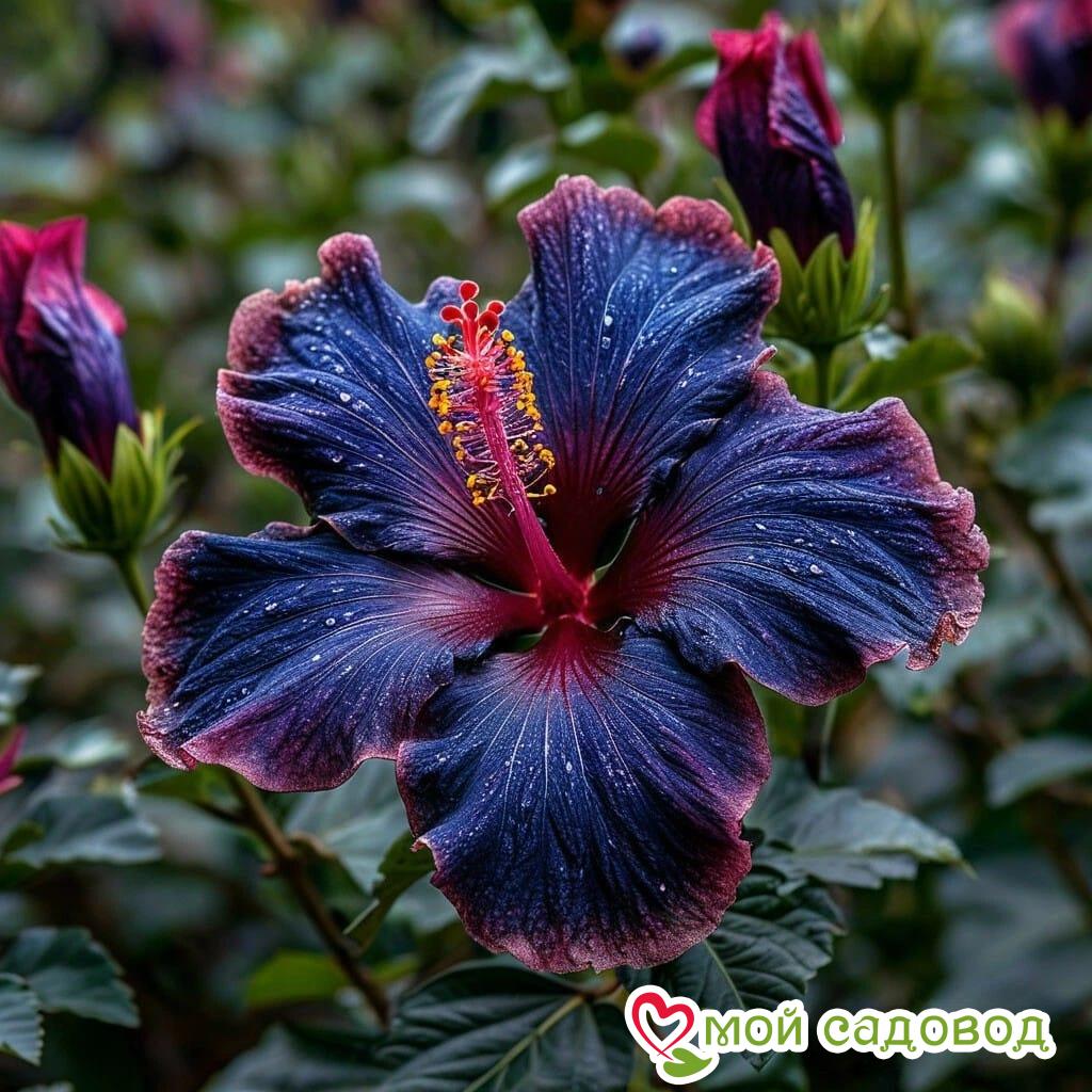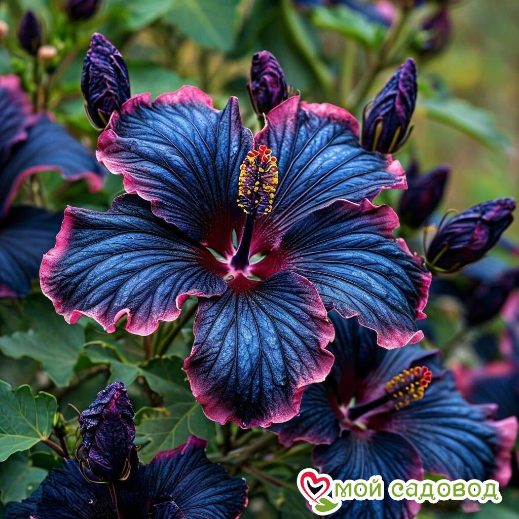 Гибискус «Голден Глоу» — настоящая жемчужина для вашего сада. Представьте: тёмные, синие, почти бархатные цветки, словно ночное небо, и яркие розовые акценты на листьях, словно золотой закат. Этот контраст делает «Голден Глоу» невероятно привлекательным и желанным для любого садовода. Этот гибискус словно создан для того, чтобы привлекать восхищённые взгляды и создавать атмосферу роскоши и таинственности в вашем саду.